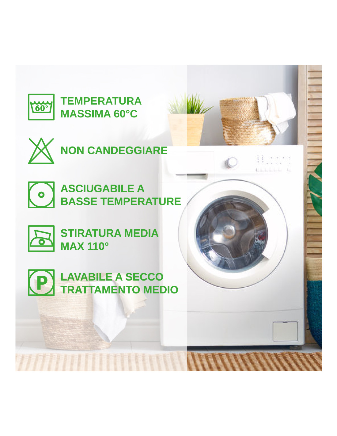 Frequenza di lavaggio | 2/3 volte l'anno I prodotti possono essere puliti con un pratico panno in microfibra che accompagna il prodotto e lavati quando necessario. | 2/3 volte l'anno I prodotti possono essere puliti con un pratico panno in microfibra che accompagna il prodotto e lavati quando necessario. | 2/3 volte l'anno I prodotti possono essere puliti con un pratico panno in microfibra che accompagna il prodotto e lavati quando necessario. |