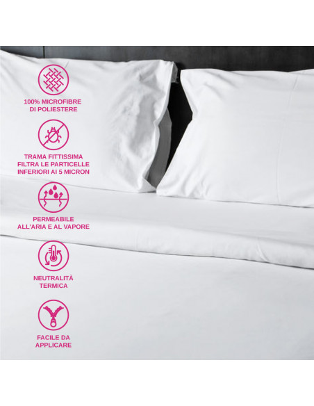 Per coprire tutti i letti di casa e contenere gli allergeni. L'acquisto del set compeleto garantisce un sicuro risparmio rispetto all'acquisto dei singoli prodotti. I prodotti della linea Sogno sono realizzati in poliestere e certificati da importanti istituti di ricerca internazionali. Coprimaterassi antiacaro, copricuscini anallergici e copripiumone sono confezionati a sacco con cerniera, sono lavabili in lavatrice a 60°C e sono garantiti 10 anni.