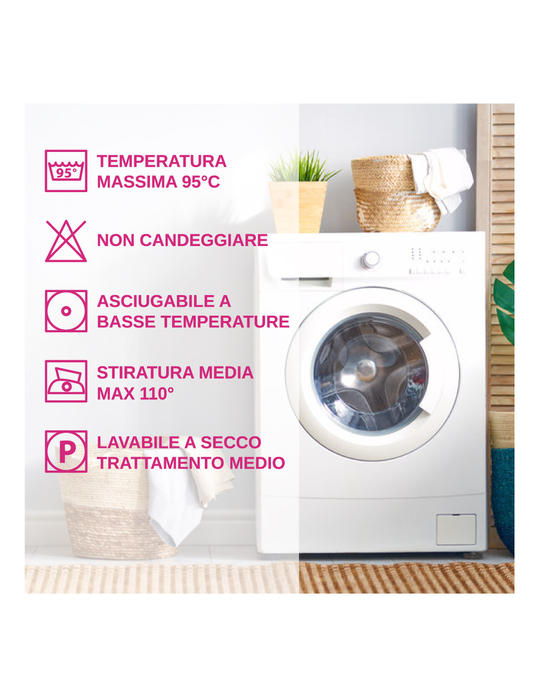 MANUTENZIONE: le coperture antiacaro della LINEA SOGNO sono facili da pulire. Il prodotto può essere lavato in lavatrice ad una temperatura di 95°C. È anche possibile procedere con la pulizia del coprimaterasso utilizzando l’apposito panno in microfibra fornito in dotazione insieme al prodotto.